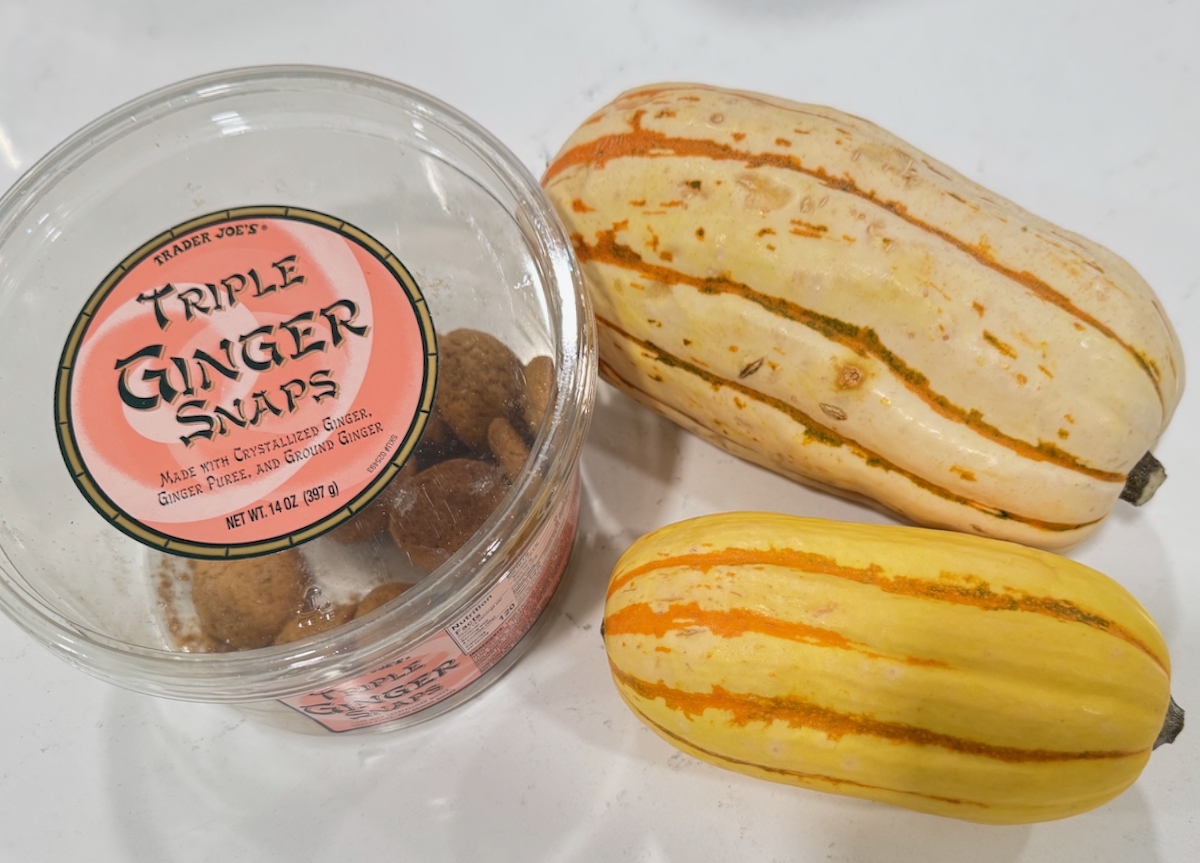 Start here, with the Delicate Squash Pie, with the purchase of medium and small delicate squash. I decided to swap out the graham cracker crumbs for Ginger Snap crumbs, and used Trader Joe’s brand for those cookies.