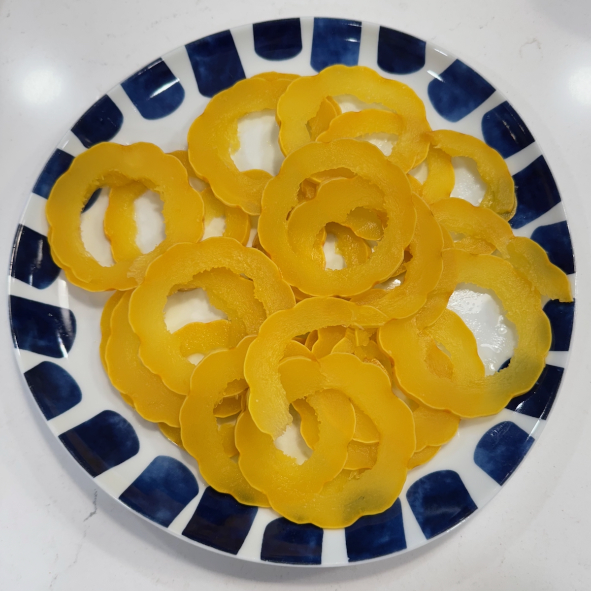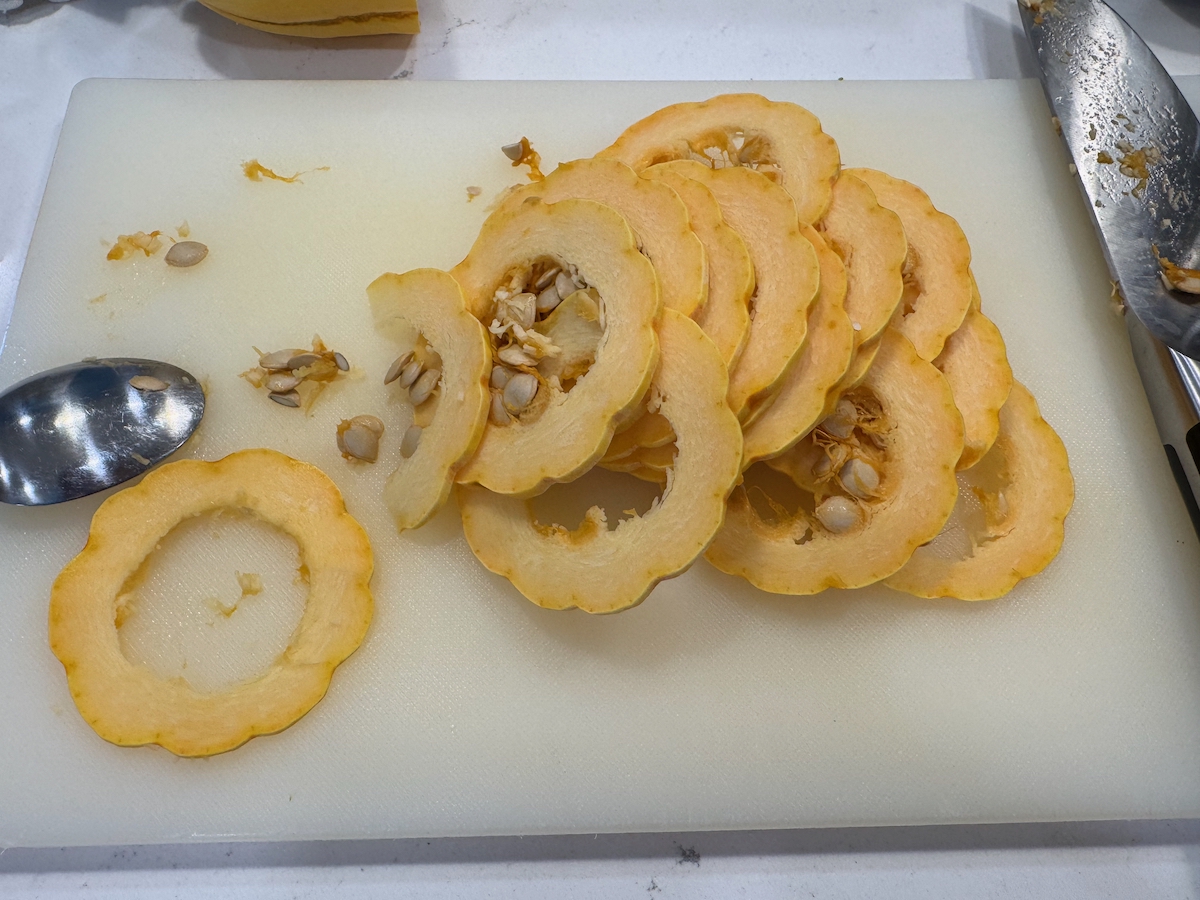 - Step 4: Prepare the topping: With a sharp and heavy knife, cut about 25 thin rings (less than ¼-inch thick) from one end of the squash. Scraping away any seeds and stringiness with a spoon, then set the rings aside.