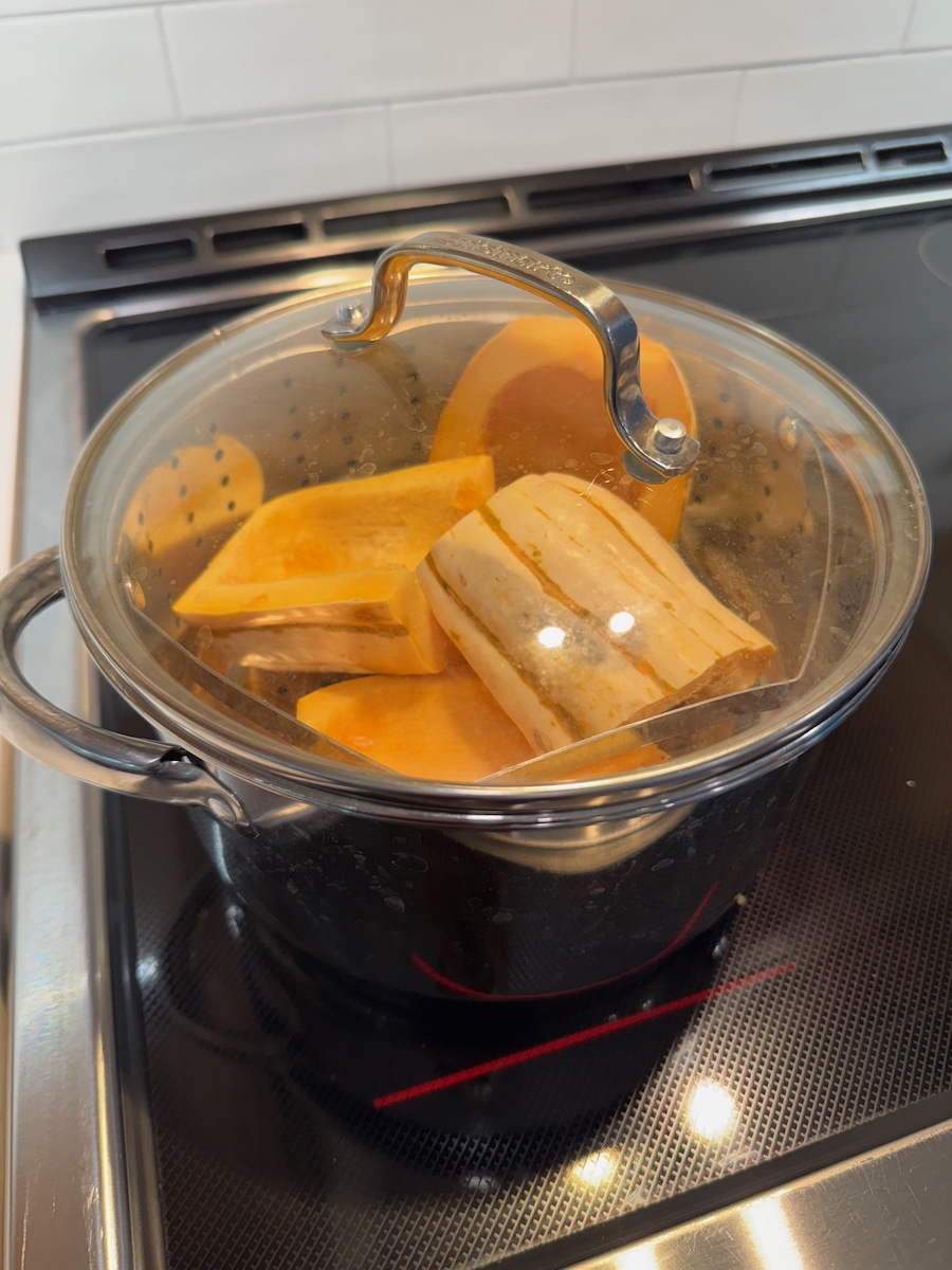 - Step 2: Prepare the filling: Trim off the ends of the squash and discard. Quarter and core the squash. Fill a large saucepan with 2 inches of water and place a steamer basket inside. Bring to a boil over high heat and add the squash quarters. Lower the heat to medium, cover with a fitted lid and steam the squash until tender, about 15 minutes. Transfer the steamed squash to the bowl of a food processor and let it cool slightly, about 10 minutes. [No need to remove skin.] Blend until completely smooth. (You should have about 1 cup.)