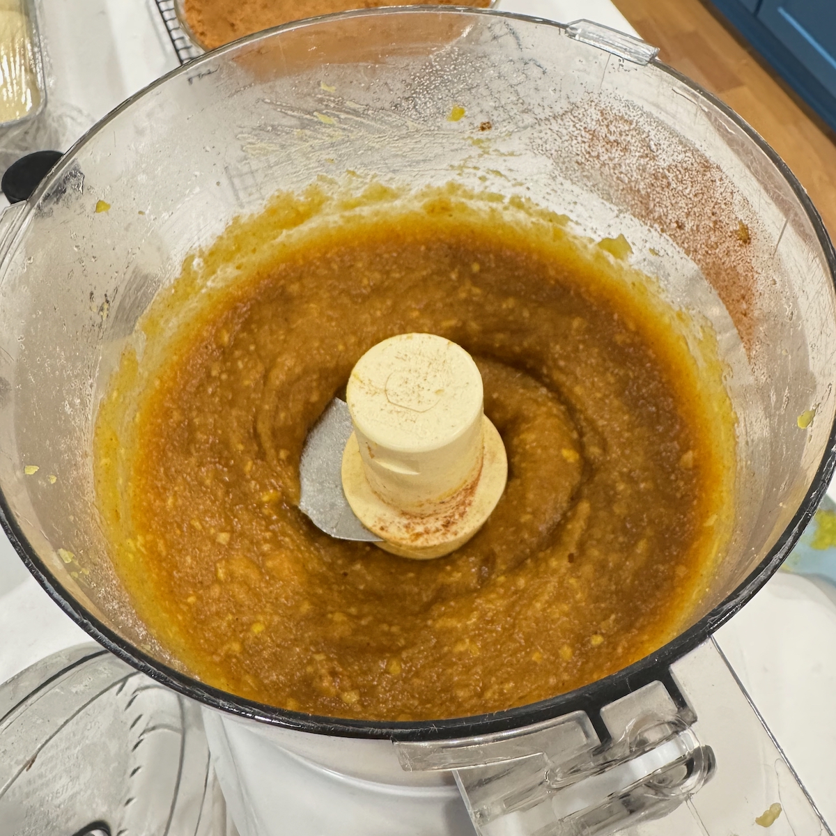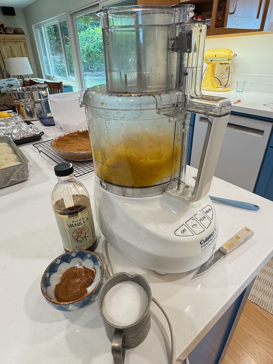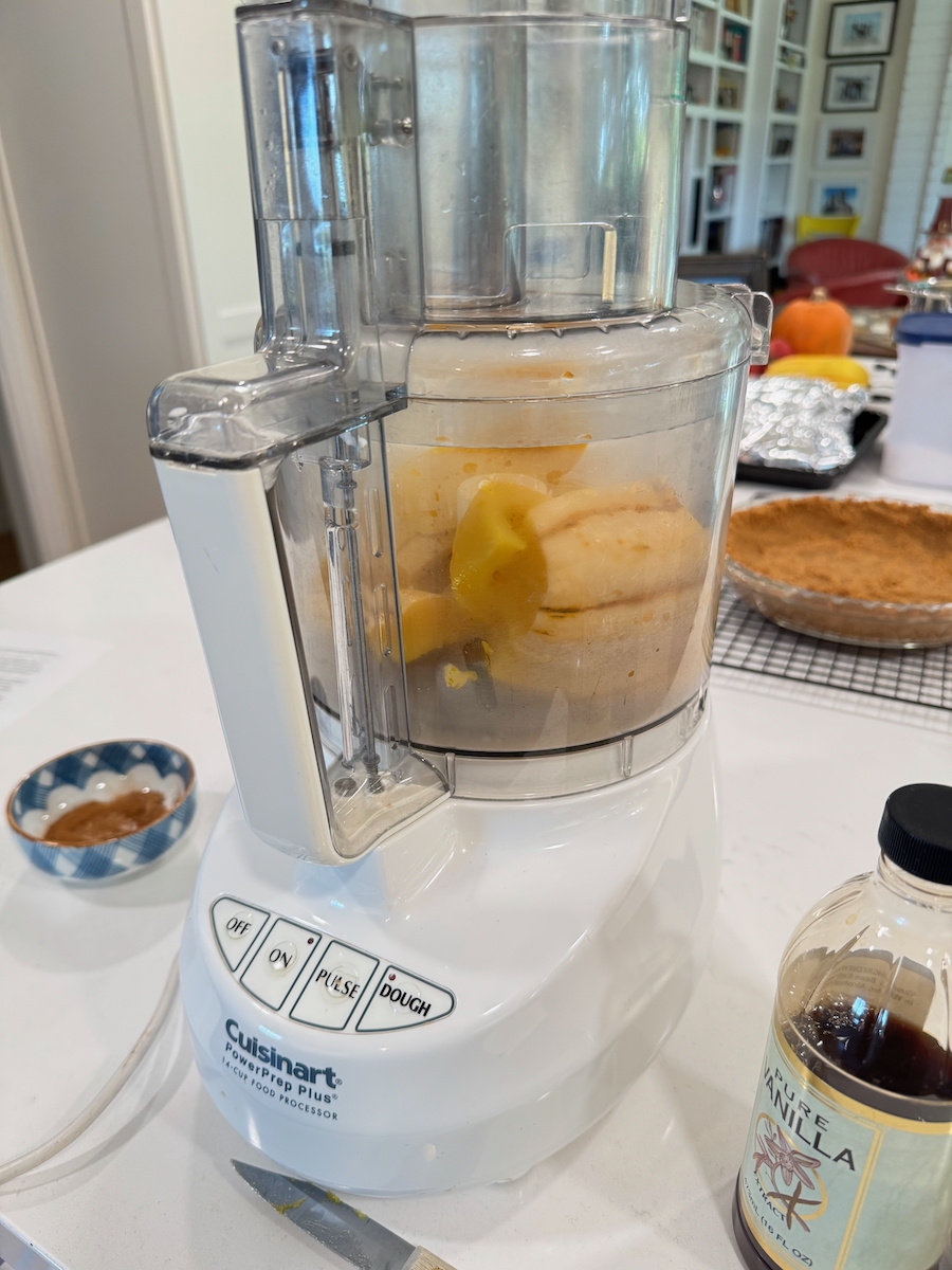 - Step 3: Add the sugar, cinnamon, nutmeg, cloves, vanilla and salt to the food processor, and blend until smooth. Add the cream and eggs, and blend again until smooth and combined. Place the cooled pie crust on a baking sheet and scrape the squash mixture into the crust. Bake until the edges of the custard are set and the center is slightly wobbly when you shake the pan, about 50 minutes to 1 hour, rotating halfway through. Check often near the end to avoid burning the pie. Remove the pie from the oven and allow it to cool at room temperature on a rack.